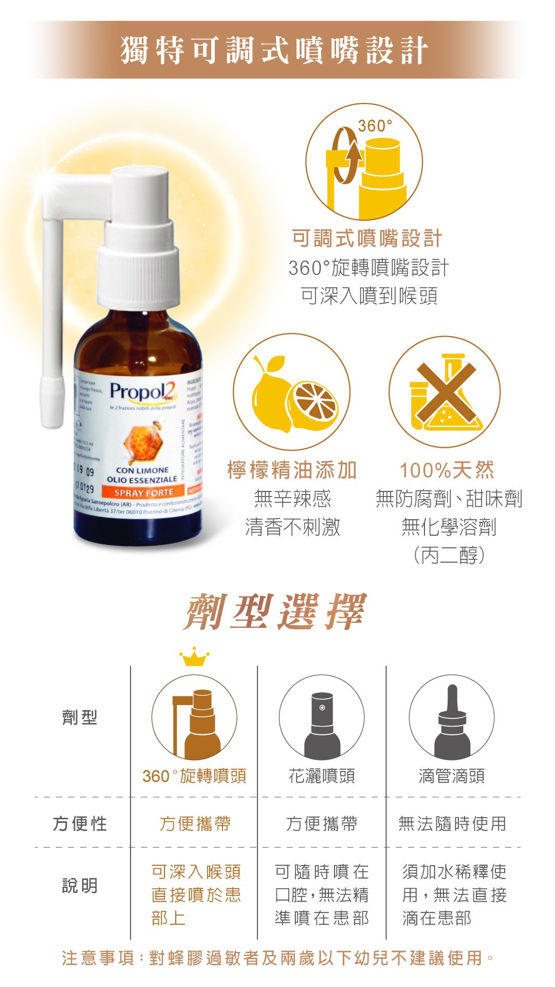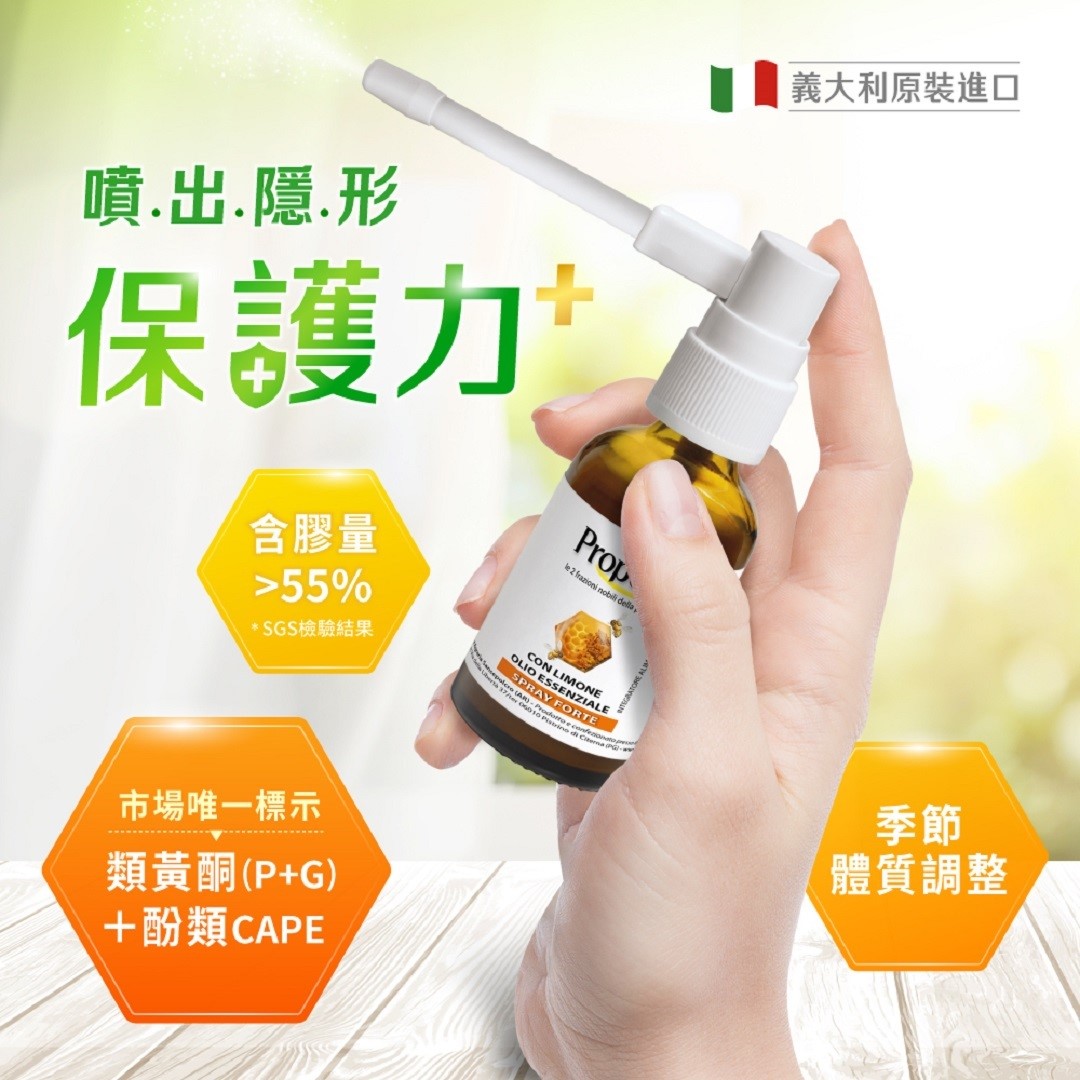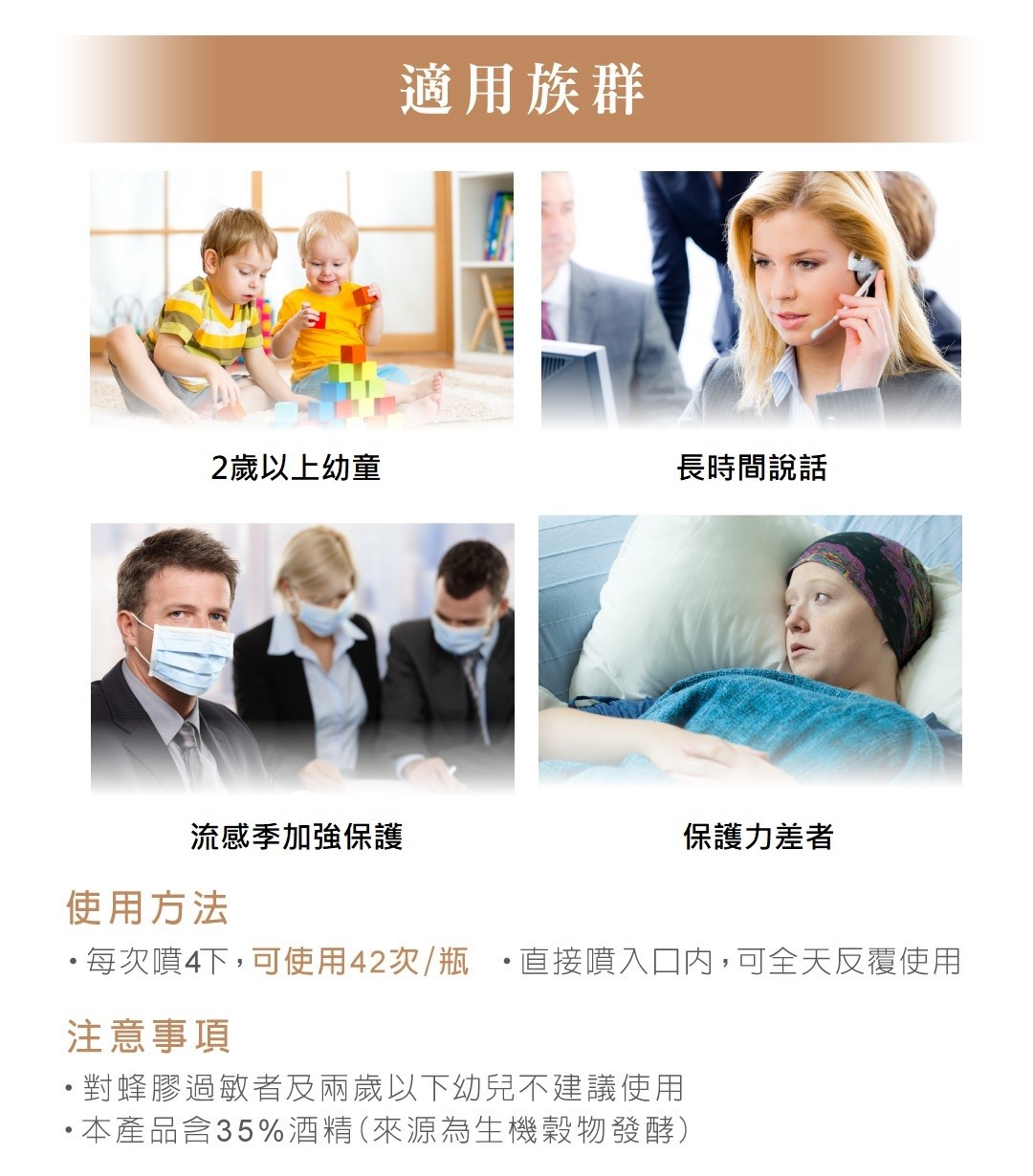 實驗證明10倍保護力 噴出隱形保護力 歐洲蜂膠黃金成分類黃酮(P+G)+CAPE 定性定量有效成分 生機穀物發酵 生機水酒萃取 360度旋轉噴頭,可噴到喉頭