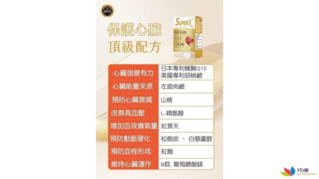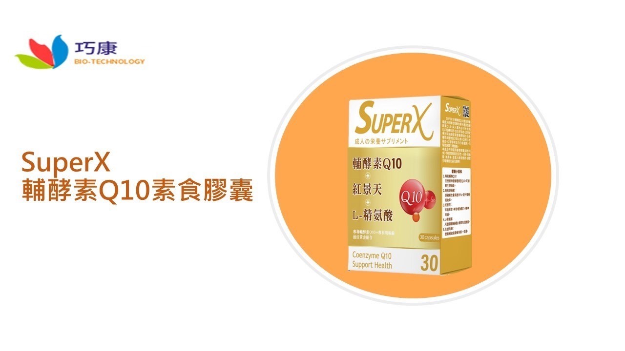 品 名:SUPER X 輔酵素Q10素食膠囊 規 格:30顆 產 地:台灣 經 銷 商:巧康有限公司
