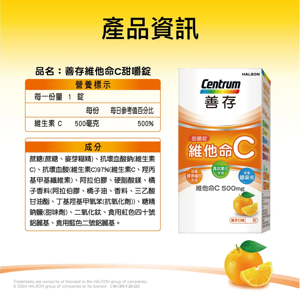 品 名:善存維他命C甜嚼錠 規 格:60粒/盒 產 地:台灣 經 銷 商:輝瑞生技股份有限公司